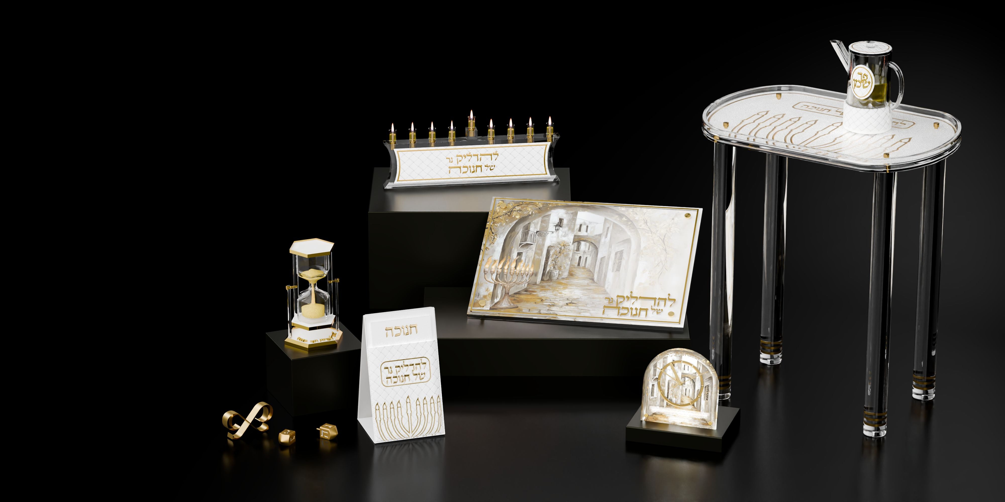 Des lignes épurées, des accents dorés et un design durable en font une collection incontournable pour les jeunes mariés, les kallahs et les donneurs de cadeaux élégants.