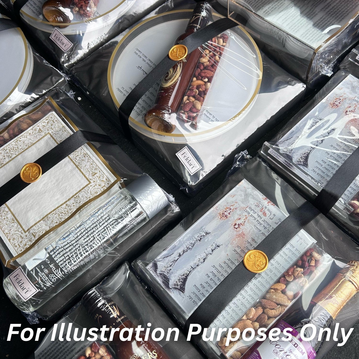 Présenté sur une base emballée, le mishloach manos sera emballé sous film rétractable avec un ruban et un sceau de cire