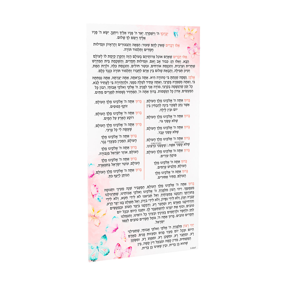 Ce joli papillon Birchas Hashachar est imprimé recto verso sur de l'acrylique blanc. Propre et compact, toujours à portée de main, éliminant le besoin de chercher un Siddur.