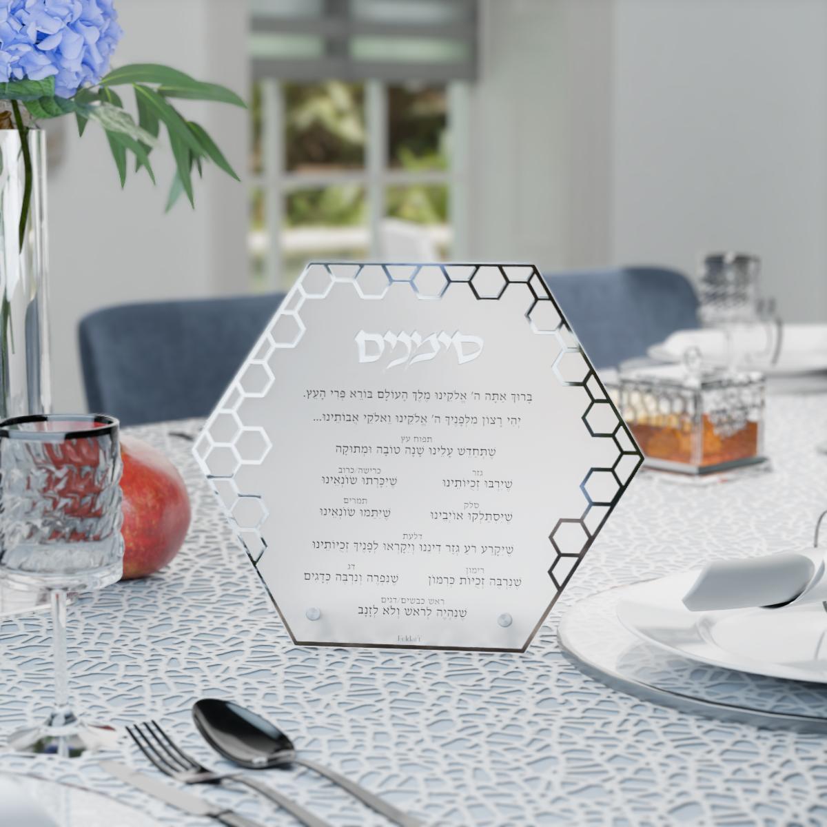 Une superbe carte Simanim en nid d'abeille découpée au laser, dotée d'un luxueux titre en relief 3D doré et d'un effet nid d'abeille, est un ajout de bon goût et sophistiqué à la décoration de votre table Yom Tov.