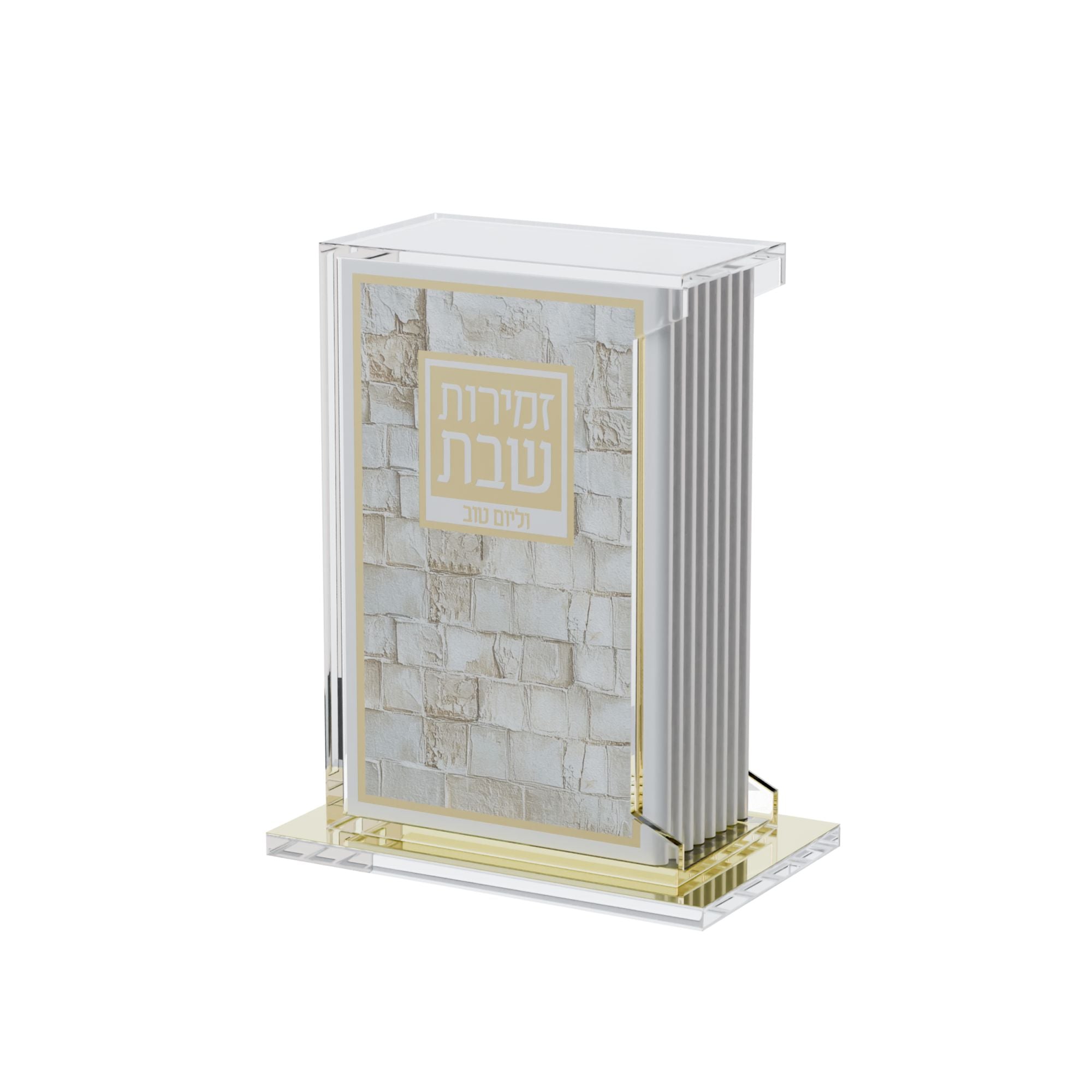 Elevate your Shabbos or Yom Tov table with this exquisite Leather & Lucite Zemiros Set. Featuring crisp, bold lettering beautifully printed and protected by a sleek, easy-to-clean softcover leather cover, it combines style and durability. Housed in a chic lucite holder, the set remains pristine and ready for use. This Zemiros collection adds a sophisticated touch to your table decor or makes an exquisite gift.